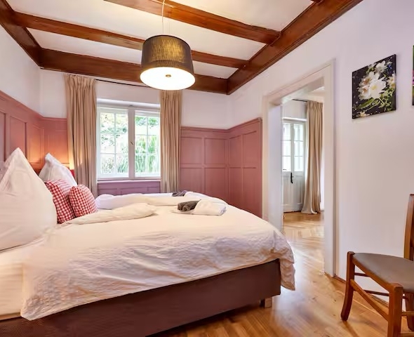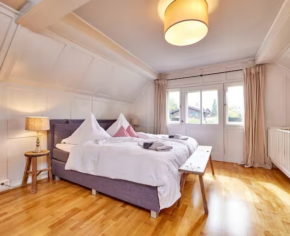 Das Haus bietet 5 Schlafzimmer, 3 Bäder, 1 separates WC, Esszimmer, Wohnzimmer mit Kachelofen, voll ausgestattete Küche, Lesestube, großen Garten mit Gartenmöbeln, 2 Balkone sowie 2 Terrassen und einen Wintergarten. Waschmaschine und Trockner, Skistiefel-Trockner, eine Garage mit Stellplatz und WLAN sind selbstverständlich vorhanden.